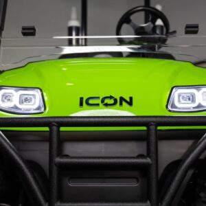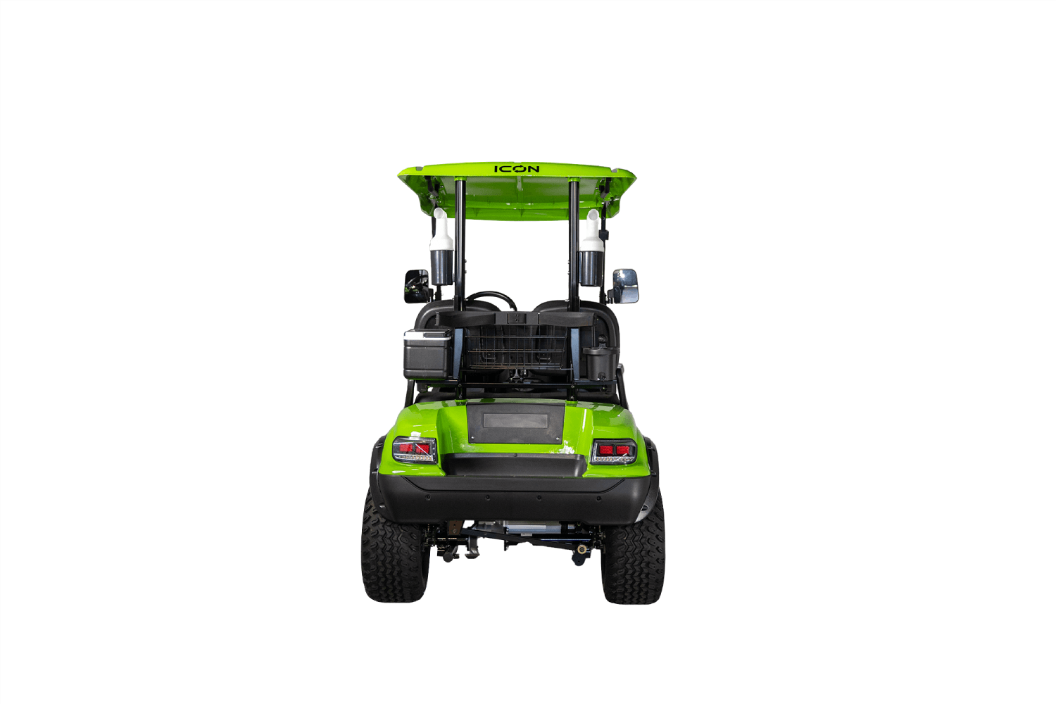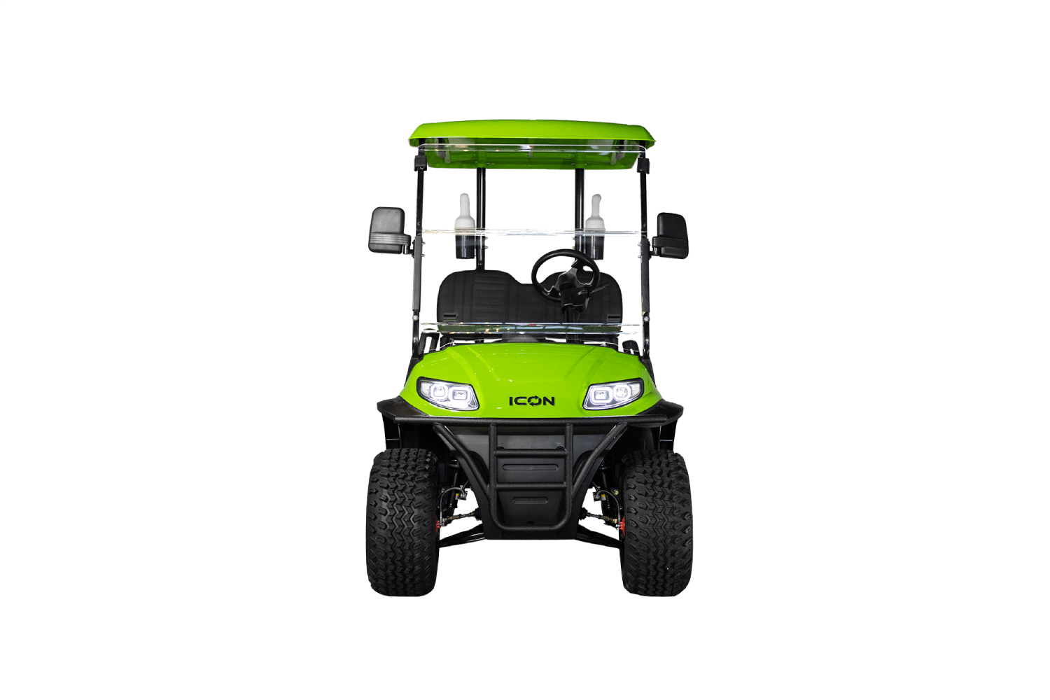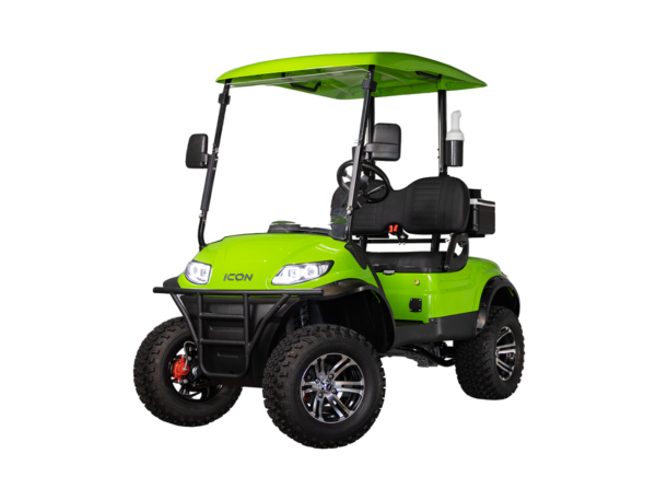 Up your game with this lifted two-seater ICON® i20L golf cart! The lifted i20’s are loaded with class-leading features like 12″ aluminum wheels, lights, turn signals, high-speed rear ends, functional front and rear bumpers, painted rooftops, horns, digital gauges, and more.