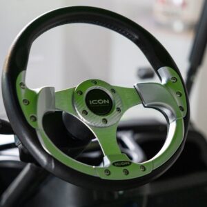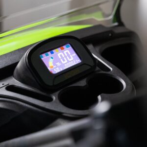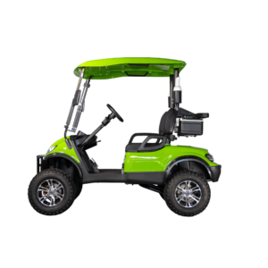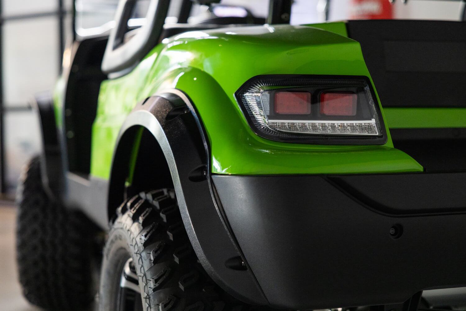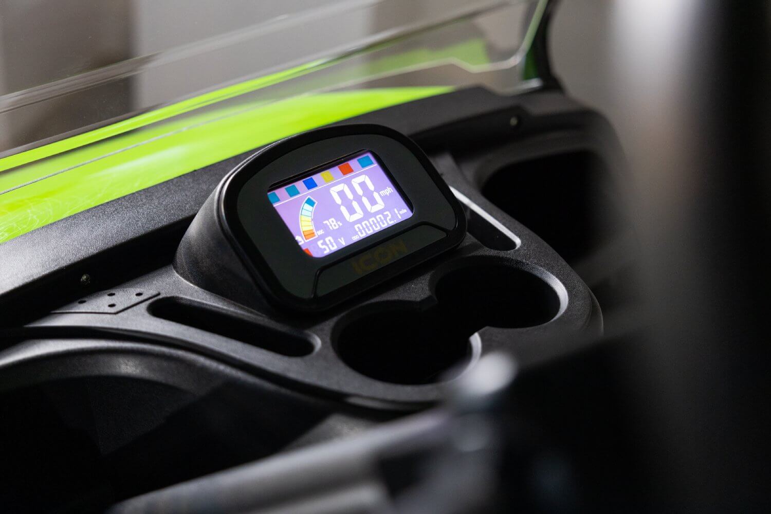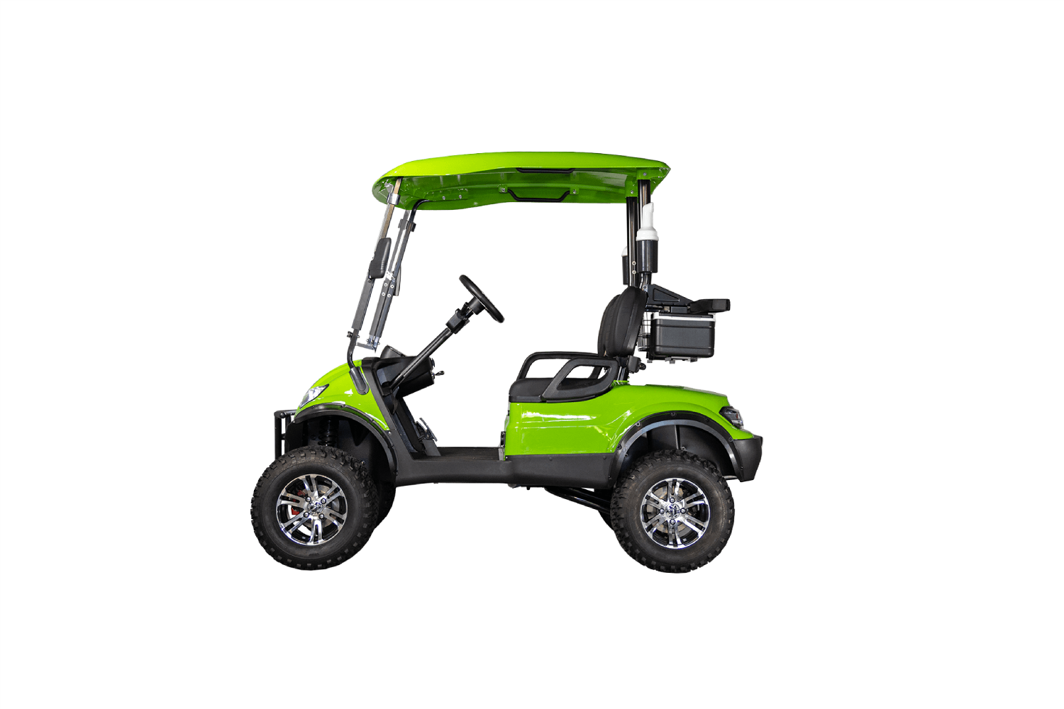 Up your game with this lifted two-seater ICON® i20L golf cart! The lifted i20’s are loaded with class-leading features like 12″ aluminum wheels, lights, turn signals, high-speed rear ends, functional front and rear bumpers, painted rooftops, horns, digital gauges, and more.